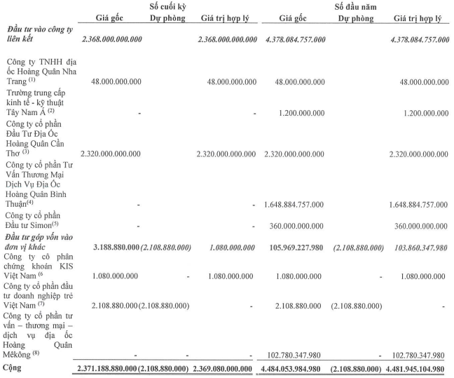 Trong các công ty liên kết mà HQC đã thoái vốn, CTCP Tư vấn Thương mại Dịch vụ Địa Ốc Hoàng Quân Bình Thuận là tiêu biểu nhất khi vào đầu năm, giá trị đầu tư của HQC vào công ty này gần 1,649 tỷ đồng. Đơn vị này là chủ đầu tư của dự án Khu đô thị mới Nam Phan Thiết (13.5 ha) và KCN Hàm Kiệm 1 (146.2 ha) tại Bình Thuận.