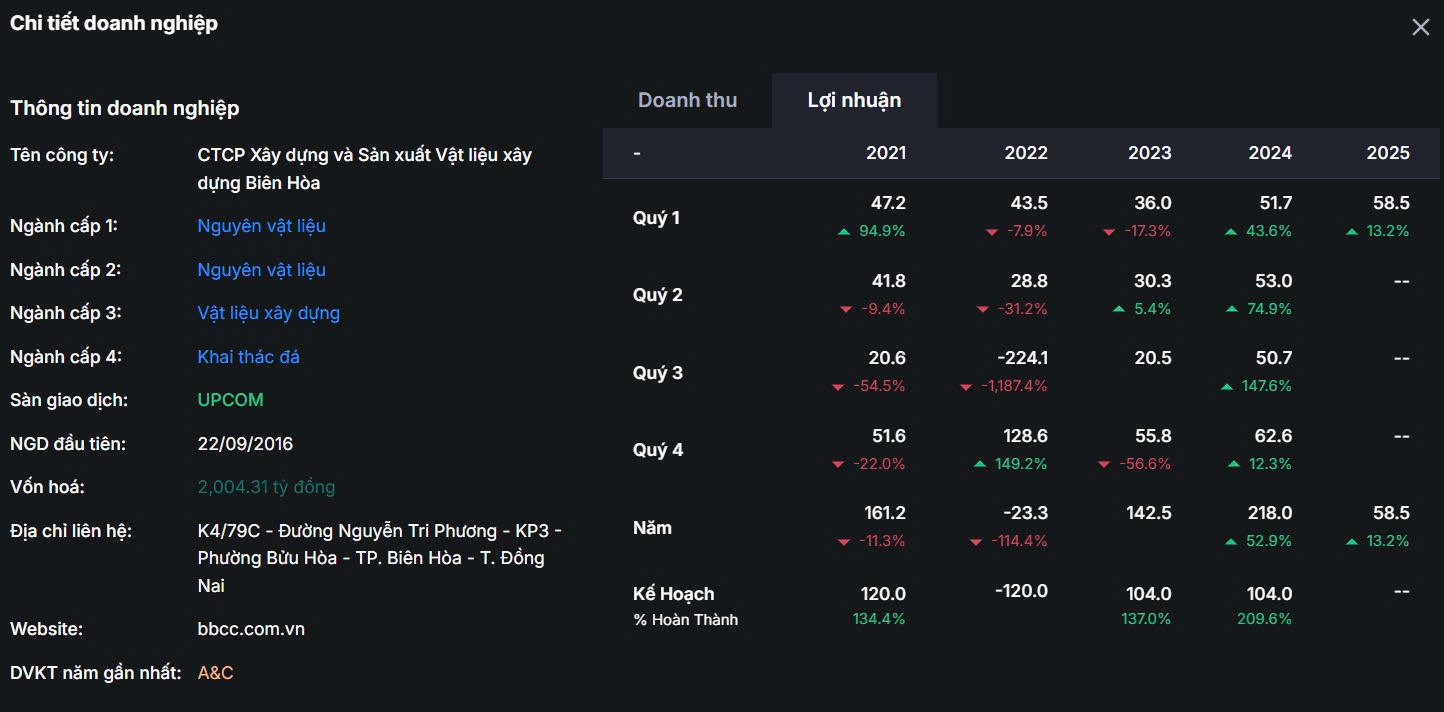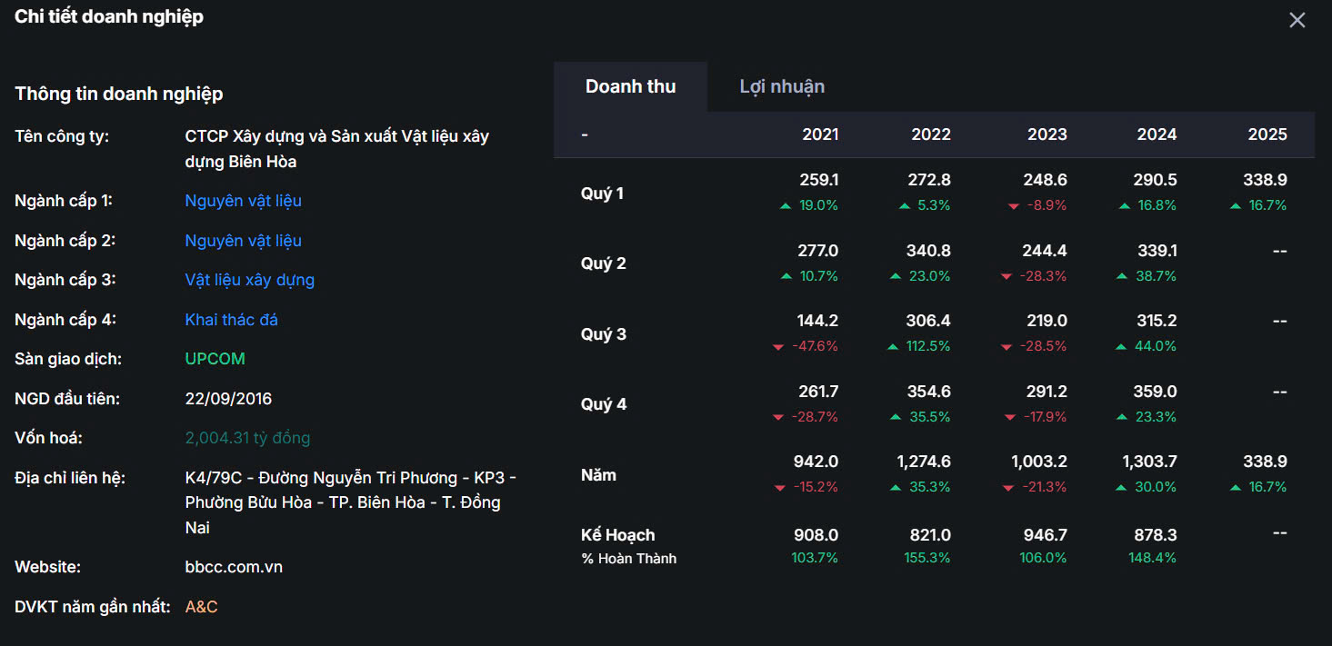 Q1/2025: Doanh thu 339 tỷ đồng (+17% YoY), LNST 59 tỷ đồng (+13% YoY). Biên lợi nhuận gộp 27,1%, biên LNST 17,3%. Đá xây dựng tăng sản lượng nhưng biên lợi nhuận giảm (28,5% từ 34,4%), VLXD tăng mạnh (doanh thu 95 tỷ đồng, biên 27,7%).