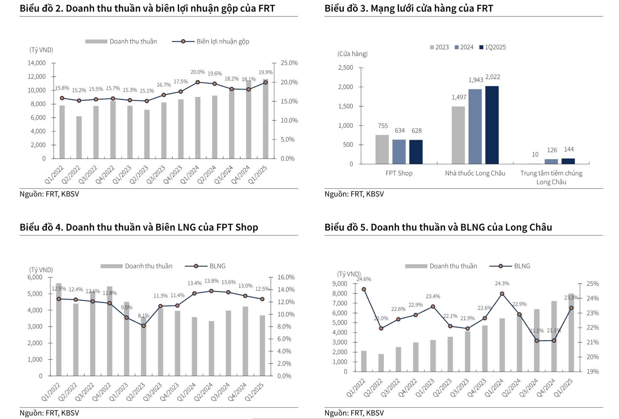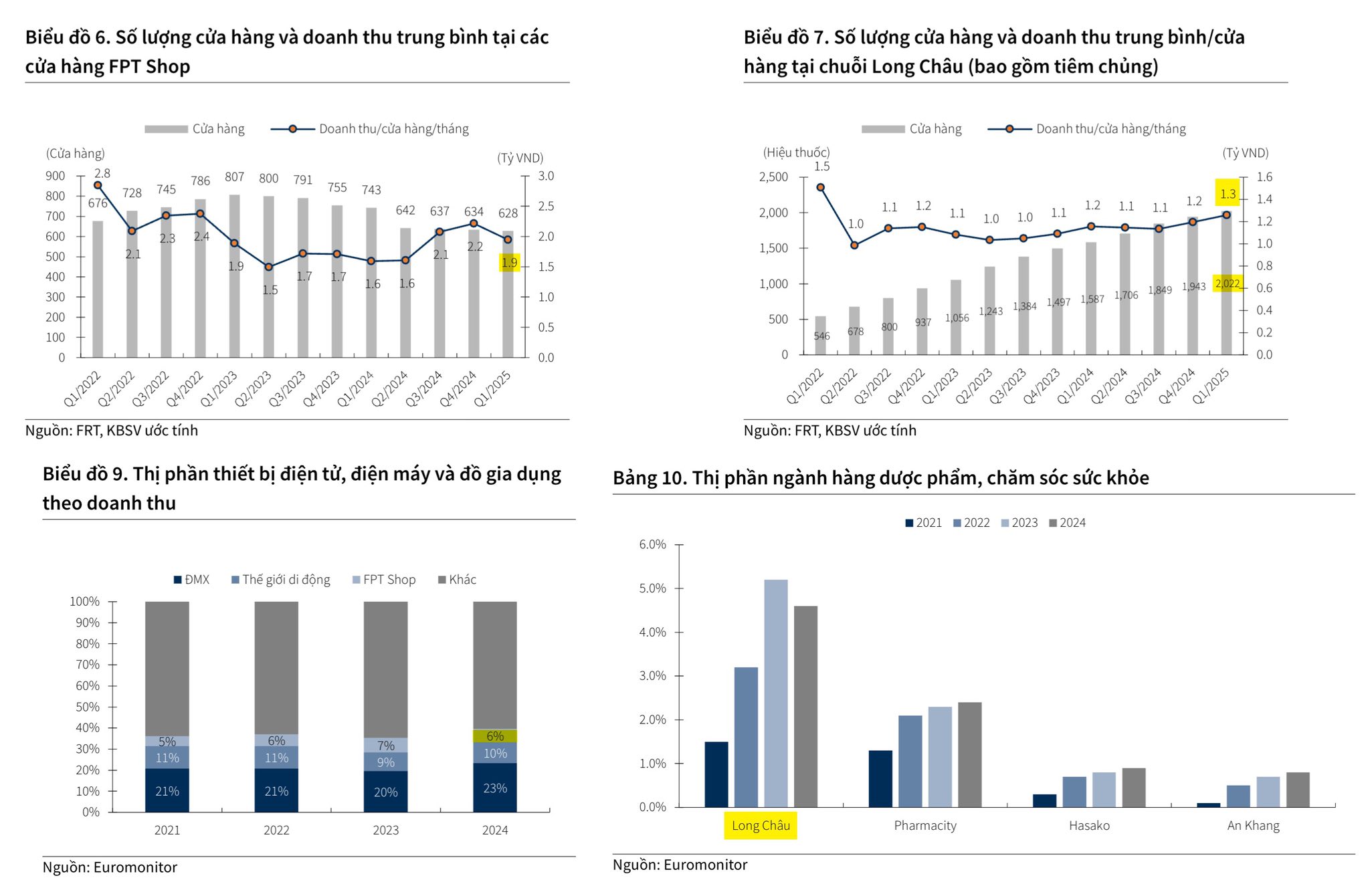 Long Châu là động lực tăng trưởng chủ lực của FRT, hiện đang dẫn đầu thị trường bán lẻ dược phẩm với hơn 2.000 nhà thuốc trên toàn quốc. Tốc độ tăng trưởng doanh thu kép đạt 59% trong giai đoạn 2021–2024. Doanh thu trung bình mỗi cửa hàng đã lên tới 1,3 tỷ, kèm theo biên lợi nhuận cải thiện từ 21,1% lên 23,3%.