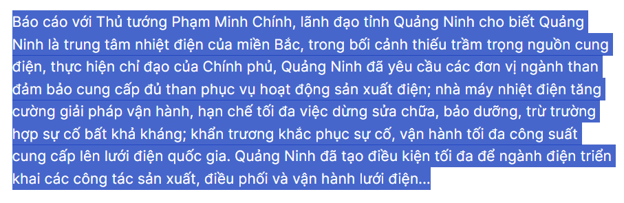Thủ tướng Phạm Minh Chính đã tới thăm, kiểm tra hoạt động sản xuất tại Công ty Nhiệt điện Mông Dương, Công ty Cổ phần nhiệt điện Quảng Ninh, Công ty Cổ phần than Hà Tu và làm việc với tỉnh Quảng Ninh, Tập đoàn Công nghiệp Than - Khoáng sản Việt Nam, Tập đoàn Điện lực Việt Nam.