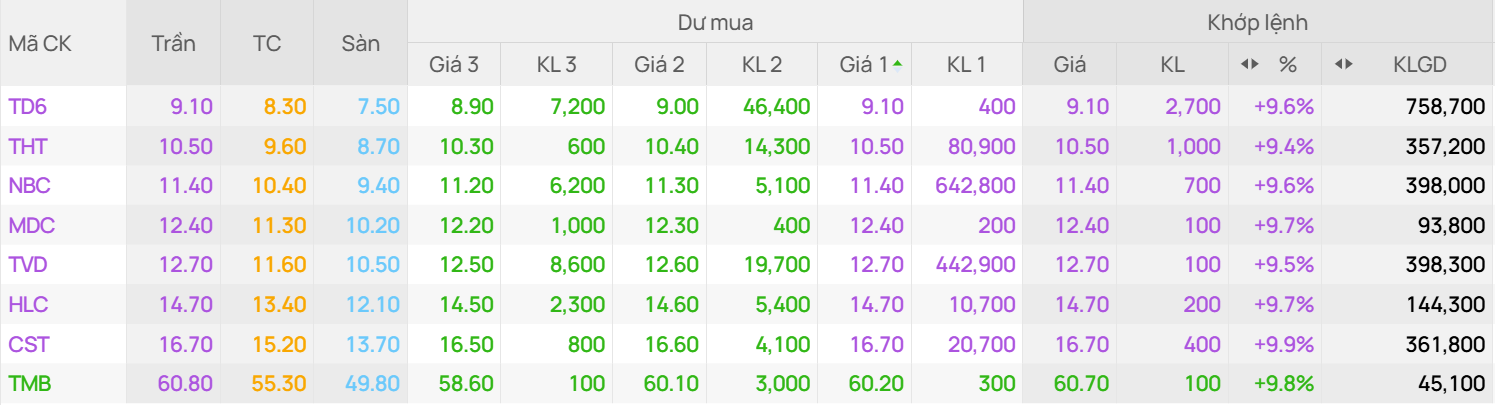 Một điểm nhấn đáng chú ý trên bảng điện là nhóm cổ phiếu ngành than khi lực cầu áp đảo, đẩy hàng loạt mã tăng trần ngay từ đầu phiên như TD6 (Than Đèo Nai), THT (Than Hà Tu), NBC (Than Núi Béo), MDC (Than Mông Dương)…