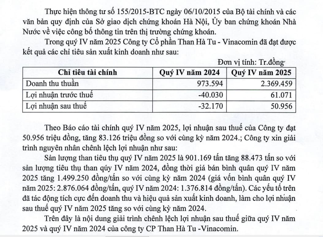 Cùng xem giải trình lợi nhuận quý 4-2025 khủng của THT. Đương nhiên giá than trong nước sẽ không tăng theo kiểu điều chỉnh như giá xăng dầu nhưng cải thiện lợi nhuận là chắc chắn. Chưa kể tồn kho giá rẻ tăng mạnh với THT lên đến gần 800 tỷ chỉ cần Lợi nhuận sau thuế quý 1-2026 đâu đó tương đường quý 4-2025 khoảng 40-50 tỷ thôi thì định giá của THT lại siêu rẻ vì quý 1-2025 khi đó THT lỗ tới 53 tỷ sau thuế.