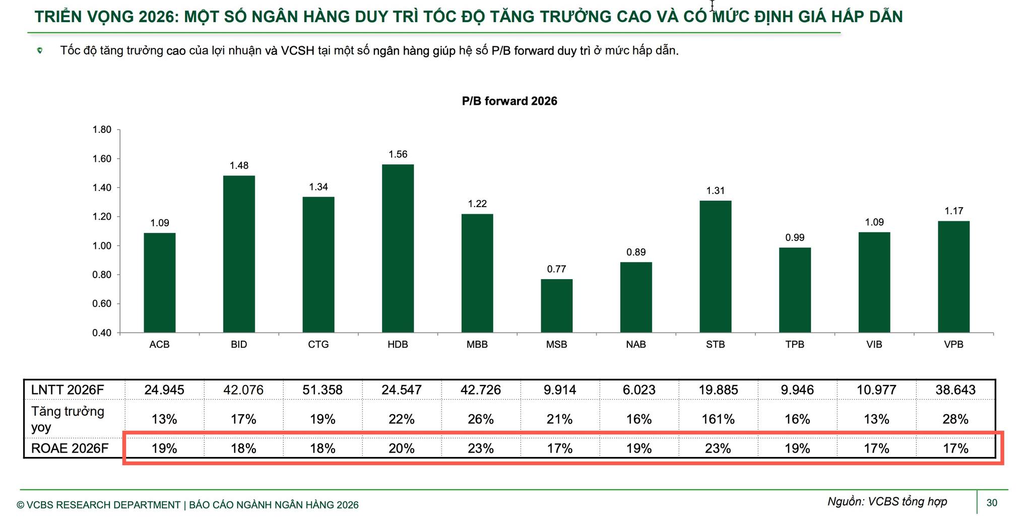 Tất cả bank trong đánh giá đều có ROE năm 2026 từ 17% - 23% là mức cao. Với mình thì thường chỉ số này cao thế đã là đủ, mình không cố gắng so sánh quá để sàng lọc trừ khi đột biến. Nhưng ở đây đã hướng đến kết luận hiệu quả đều ổn.
