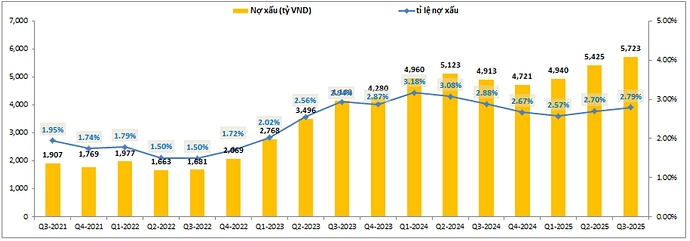 Bức tranh tài chính của MSB trong Q3 vừa qua về cơ bản không có biến động lớn mà chỉ thay đổi nhẹ so với Q2 gần nhất theo hướng tiêu cực đi một chút. Đầu tiên đó là nợ xấu và tỉ lệ nợ xấu tăng nhẹ so với Q2-2025. Cụ thể nợ xấu tăng lên 5,723 tỷ đồng, tỉ lệ nợ xấu đạt 2.79%. Đáng chú ý đây là quý thứ 2 liên tiếp tỉ lệ nợ xấu của MSB tăng trở lại sau giai đoạn liên tục giảm và tạo đáy vào Q1-2025 với 2.57%. Như vậy tỉ lệ nợ xấu đã tăng 0.22% sau 2 quý gần đây.Tuy nhiên nhờ vẫn kiểm soát được nợ nhóm 2 ở mức thấp sẽ giúp cho MSB bớt áp lực hơn trong kiểm soát nợ xấu của ngân hàng. (Hình 5)