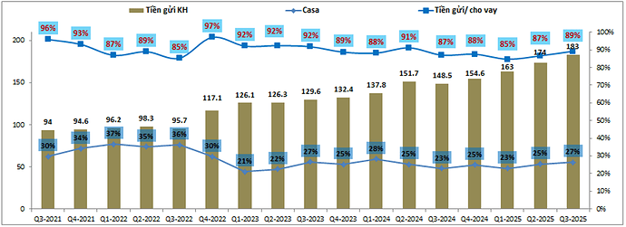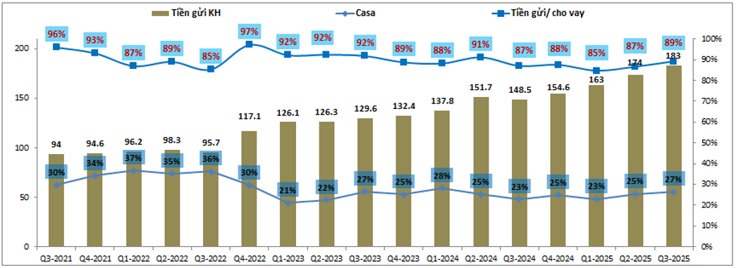 Về huy động đầu vào, MSB vẫn đang huy động khá tốt từ đầu năm 2025 tới nay, mức tăng trưởng tiền gửi đạt 18% so với đầu năm và đây là mức cao hơn so với tăng trưởng tín dụng, điều này giúp cho MSB khá tự chủ về nguồn tiền đầu vào và không áp lực phải tham gia vào làn sóng tăng lãi suất trong ngắn hạn để huy động tiền cho vay năm tới. Hiện tỉ lệ huy động/ cho vay của MSB đạt khoảng 89%, cao hơn mức 88% đầu năm và Casa cũng được nâng lên 27% so với 25% đầu năm. (Hình 3)