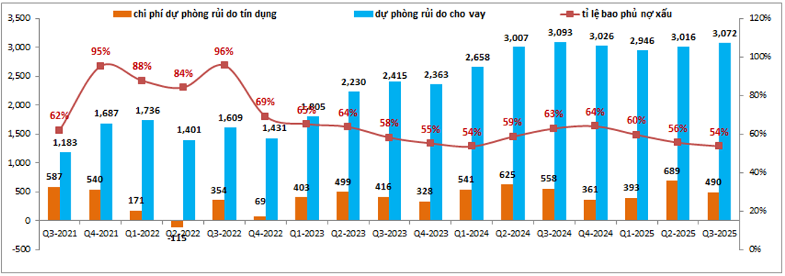 Về trích lập, MSB vẫn duy trì mức trích lập tương đương các năm trước trong bối cảnh nợ xấu lại có xu hướng tăng trở lại trong 2 quý gần đây đã khiến cho bộ đệm dự phòng của ngân hàng có phần sụt giảm trong các quý gần đây. Cụ thể tỉ lệ bao phủ nợ xấu của MSB tại Q3-2025 chỉ còn 54%, giảm 10% so với đầu năm và đây cũng là mức thấp nhất trong 5 năm gần đây của ngân hàng cũng như mức thấp so với các ngân hàng khác trong ngành. (Hình 6)