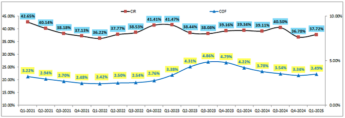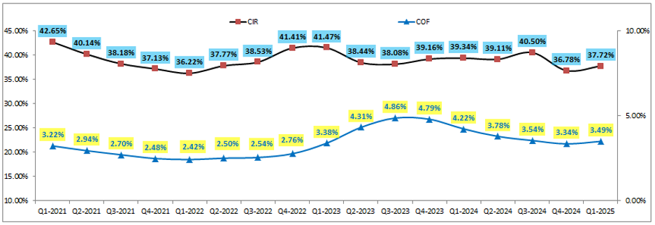 Ngoài ra các chỉ số kinh doanh khác ảnh hưởng chi phí hay giá vốn của ngân hàng cũng đang cho thấy những dấu hiệu tích cực hơn trong thời gian gần đây. Cụ thể hệ số CIR của ngân hàng trong Q1-2025 đạt 37.72%, ghi nhận quý thứ 2 liên tiếp hệ số CIR thấp hơn khá nhiều so với mức nền trước đó là khoảng 39-40%. Chi phí vốn COF cũng tiếp đà xu hướng giảm từ mức 4.86% vào Q3-2023 xuống chỉ còn 3.49% vào Q1-2025. (Hình 2)