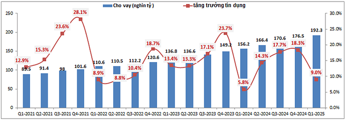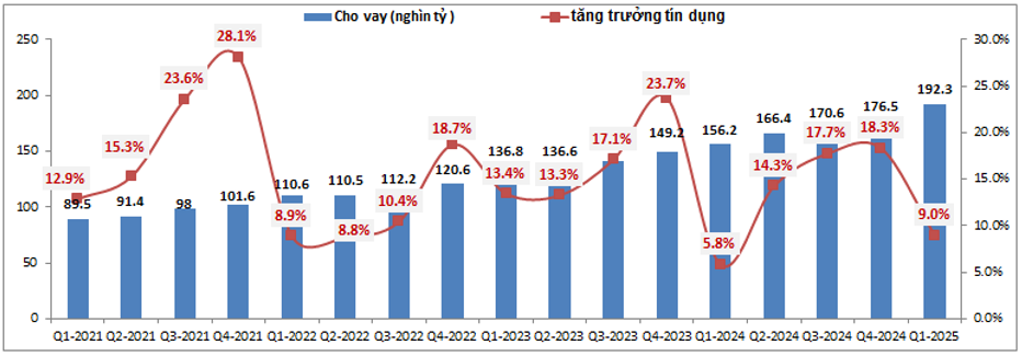 Mảng tín dụng của MSB đóng góp khoảng 76.9% tỉ trọng vào lợi nhuận gộp của ngân hàng, mức trung bình so với các ngân hàng khác trong ngành. Trong Q1-2025 MSB đã ghi nhận mức tăng trưởng tín dụng khá ấn tượng với gần 9%, cao hơn khá nhiều so với cùng kỳ 2024 (5.8%) và cũng cao hơn nhiều so với mức tăng trưởng tín dụng chung của toàn ngành (3.93%). (Hình 3)
