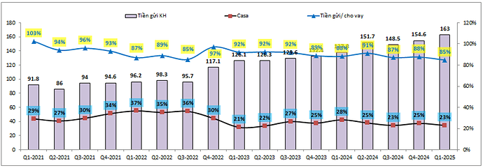 Casa của MSB cũng có mức giảm nhẹ trong các quý gần đây từ 28% từ Q1-2024 xuống còn 23% cuối Q1-2025. Tuy nhiên đây cũng là mức casa khá tốt trong ngành giúp cho chi phí vốn của MSB được kiểm soát tốt.