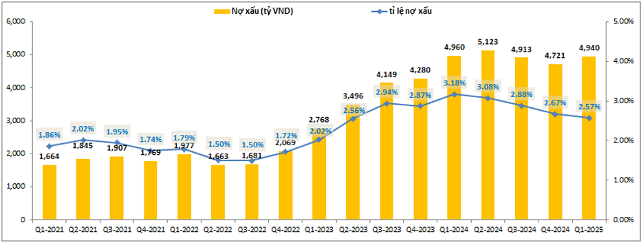Bức tranh tài chính của MSB trong các quý gần đây đang có xu hướng tốt dần lên. Cụ thể nợ xấu và tỉ lệ nợ xấu của MSB đã tạo đỉnh vào Q1-2024 và có xu hướng giảm dần trong các quý gần đây. Tỉ lệ nợ xấu tại Q1-2024 là 3.18% và hiện đã giảm xuống chỉ còn 2.57% cuối Q1-2025, tức giảm tới 0.61% sau 4 quý. (Hình 5)