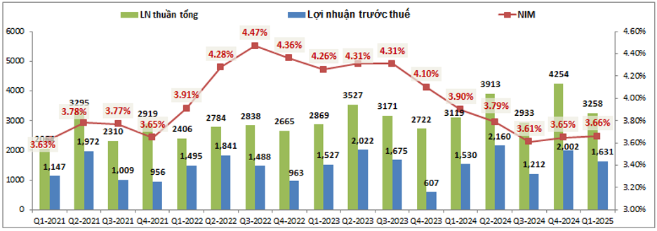 Trước tiên chúng ta sẽ cùng đi phân tích tình hình kinh doanh của ngân hàng xem tình trạng hiện tại của MSB đang ở đâu cũng như xem các yếu tố ảnh hưởng lớn tới kết quả kinh doanh của ngân hàng đang như thế nào để từ đó sẽ có cái nhìn tổng quan về ngân hàng trước khi đi sâu hơn để phân tích các yếu tố cốt lõi khác. Kết thúc Q1-2025 MSB ghi nhận lợi nhuận thuần tổng (TOI) đạt 3,258 tỷ đồng, tăng 4.5% yoy. Lợi nhuận trước thuế ghi nhận 1,631 tỷ đồng, tăng 6.6% yoy. Đây là mức tăng trưởng nhẹ so với cùng kỳ nhưng cũng là đáng khích lệ trong bối cảnh ngân hàng trải qua giai đoạn khó khăn trước đó. (Hình 1)
