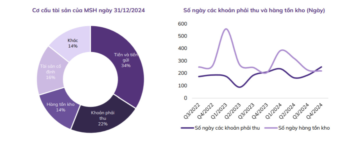 Tính đến 31/12/2024, tổng tài sản của MSH đạt 4.520,6 tỷ đồng, tăng 30,9% so với đầu năm. Trong đó, tiền mặt và đầu tư tài chính ngắn hạn chiếm 34% tổng tài sản, tương đương 1.539 tỷ đồng. MSH duy trì 1.293 tỷ đồng đầu tư vào trái phiếu, giúp tối ưu hóa nguồn vốn nhàn rỗi.