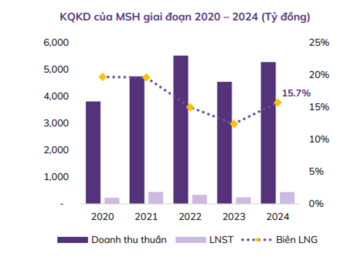 Với việc mở rộng công suất từ nhà máy Xuân Trường và xu hướng gia tăng đơn hàng xuất khẩu sang Mỹ, doanh thu của MSH năm 2025 được kỳ vọng đạt 5.830 tỷ đồng (+10,5% svck), trong khi LNTT dự kiến tăng lên 595 tỷ đồng (+10% svck). Biên lợi nhuận gộp có thể tiếp tục duy trì xu hướng cải thiện, hướng tới mức 16% vào năm 2025.
