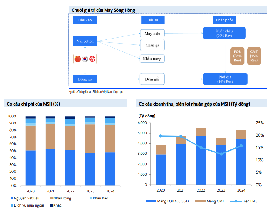 Về phương thức sản xuất, May Sông Hồng sản xuất theo hai phương thức chính là FOB*, CMT* với tỷ trọng lần lượt đạt 84% và 16% doanh thu năm 2024. Với phương thức FOB (Free-onBoard), công ty chủ động tìm kiếm nhà cung cấp nguyên vật liệu đầu vào, sản xuất và giao hàng đến cảng do khách hàng chỉ định. Còn CMT (Cut-Make-Trim) là phương thức gia công thuần túy, doanh nghiệp nhập nguyên liệu từ nhà cung cấp do khách hàng chỉ định và thực hiện công đoạn cắt, may, hoàn thiện sản phẩm.
