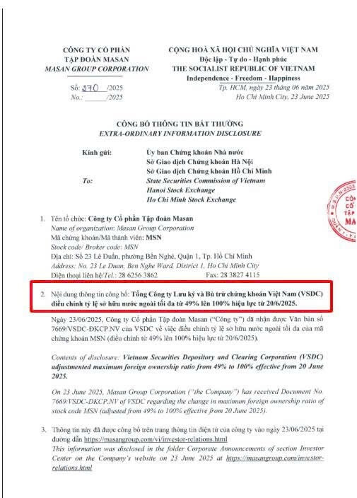 Masan đang đặt mức room ngoại là 49% và khối ngoại đang sở hữu gần 30% tại Masan. ĐHCĐ của MSN đã bãi bỏ điều khoản liên quan đến FOL ở mức 49% để tuân thủ quy định mới (Nghị quyết 155/2020/NĐ-CP).