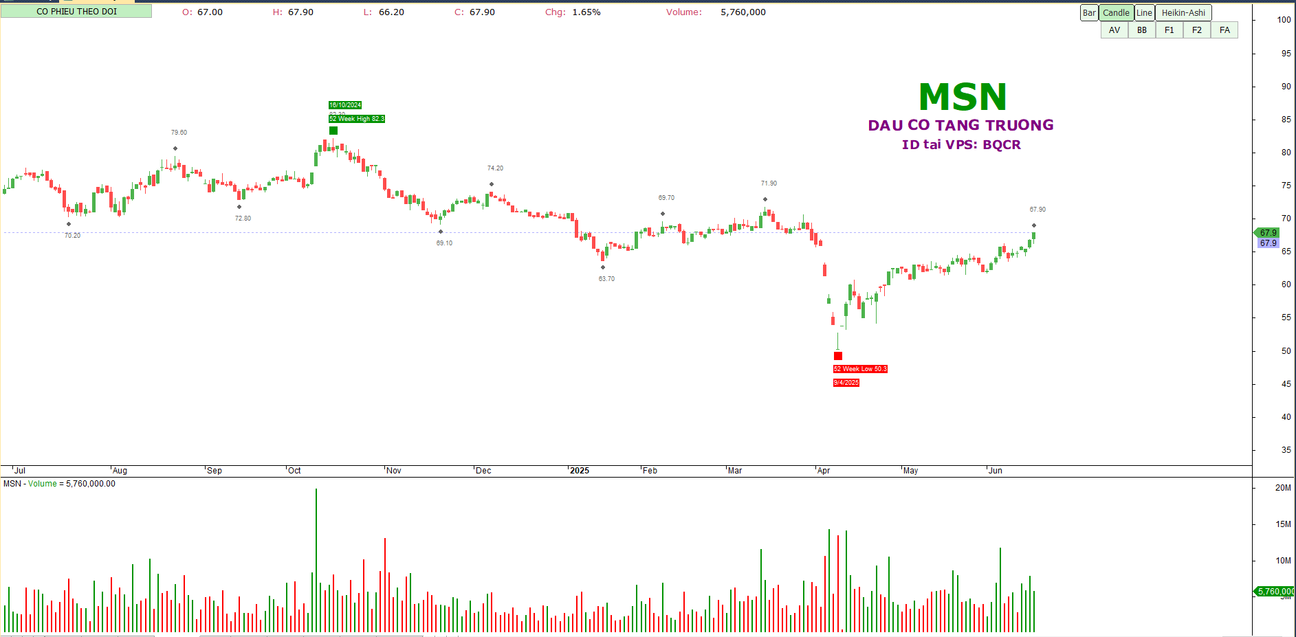 MSN theo mô hình Wyckoff hiện tại đang vận động bước vào Phase D. Cổ phiếu đã hoàn thành Phase C với nhịp Spring rũ bỏ và quét thanh khoản khi thị trường giảm mạnh với sự kiện thuế quan tháng 4/2025.