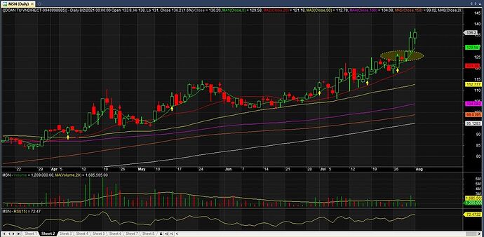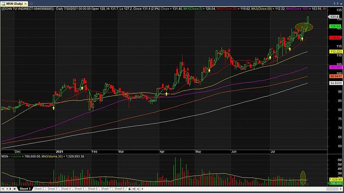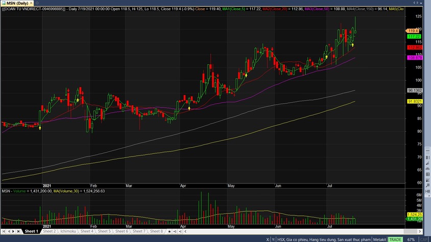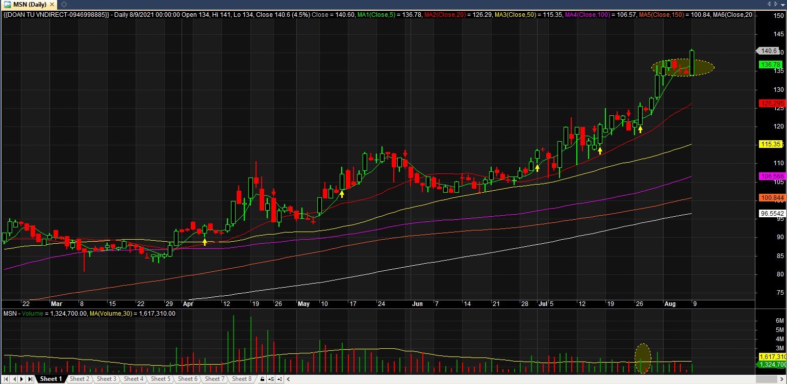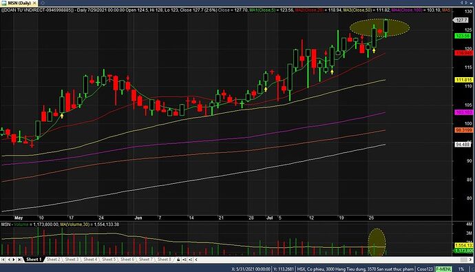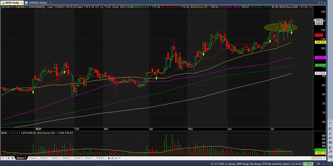 Chỉ số VNINDEX bắt đầu có dấu hiệu suy giảm mạnh từ phiên 5/7/2021, hiện tại chỉ số VNINDEX giảm 8.5%. Khi thị trường bước vào giai đoạn suy giảm, xác suất 75% các mã CP bị suy giảm theo thị trường. Trong khi mã CP MSN lại tăng khá mạnh (10.5% từ phiên 6/7/2021). Điều này chứng minh sức mạnh nội tại cũng như niềm tin của các cổ đông lớn nắm giữ CP. Kết thúc phiên giao dịch 16/7/2021, MSN tăng từ 115k lên 120.5k tương ứng mức tăng 4.8% kết hợp với khối lượng giao dịch lớn 1.97tr CP, sự kết hợp của 2 điều kiện trên đã cho tín hiệu mua cho MSN, dự báo đợt sóng mới khi thị trường có dấu hiệu hồi phục.