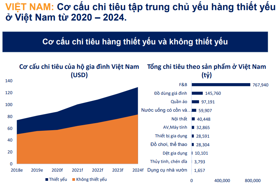 Dưới tác động của đại dịch COVID-19, doanh thu bán lẻ Châu Á giảm mạnh -27% YoY vào T4/2020 do các chính phủ buộc phải thực hiện giãn cách xã hội. Một số quốc gia mở cửa lại kinh tế sau đợt giản cách xã hội đã tăng trưởng lại ngành bán lẻ như: Việt Nam (+5% YoY), Trung Quốc (+2% YoY), Hàn Quốc (+2% YoY). Việt Nam vẫn đang chi tiêu nhiều cho sản phẩm thiết yếu do thu nhập bình quân còn thấp. Cơ cấu tiêu dùng vẫn tập trung vào sản phẩm thiết yếu chiếm 61% tổng ngân sách chi tiêu của hộ gia đình. F&B có giá trị lớn nhất đạt 767,940 tỷ đồng, tăng trưởng 12% YoY trong 2020-2024.