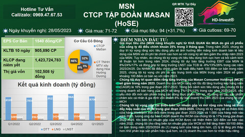 - Trong năm 2023, chúng tôi duy trì kỳ vọng rằng sức tiêu dùng yếu sẽ ảnh hưởng đến mảng kinh doanh bán lẻ tiêu dùng của MSN và chi phí tài chính cao hơn so với cùng kỳ sẽ làm giảm thu nhập năm 2023 của MSN. Tuy nhiên, do chúng tôi kỳ vọng chi tiêu tiêu dùng tích cực hơn và bối cảnh kinh tế thuận lợi hơn trong năm 2024, chúng tôi dự báo tăng trưởng EBIT của MSN là 8%/24%/17% và đóng góp từ tăng trưởng LNST của TCB là -8%/13%/26% trong các năm 2023/24/25. Do NHNN đã điều chỉnh giảm lãi suất điều hành 100 điểm cơ bản trong năm 2023, chúng tôi kỳ vọng chi phí lãi vay trung bình của MSN trong năm 2024 sẽ giảm khoảng 100 điểm cơ bản so với năm 2023.