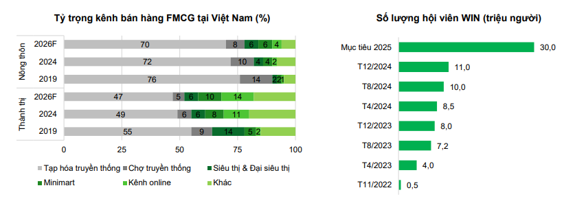 Động lực tăng trưởng này cũng phản ánh sự chuyển dịch mạnh mẽ trong hành vi tiêu dùng và bức tranh bán lẻ FMCG tại Việt Nam. Người tiêu dùng đang ngày càng mua sắm qua nhiều kênh hơn, với số kênh trung bình tăng từ 5,3 năm 2019 lên 6,0 năm 2024. Các kênh hiện đại như minimart, cửa hàng chuyên biệt, và đặc biệt là online đang gia tăng thị phần rõ rệt, trong khi kênh truyền thống (chợ, tạp hóa) giảm dần — từ 64% năm 2019 xuống còn 55% năm 2024, và dự báo tiếp tục giảm tới năm 2026. Tuy nhiên, hơn một nửa chi tiêu tại thành thị và tới 75% tại nông thôn vẫn đến từ kênh truyền thống, cho thấy tiềm năng mở rộng xen kẽ giữa hiện đại hóa và duy trì độ phủ sâu rộng.