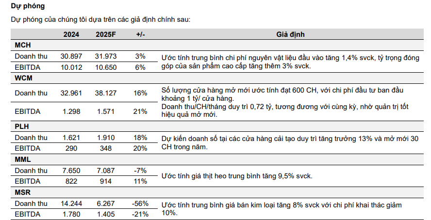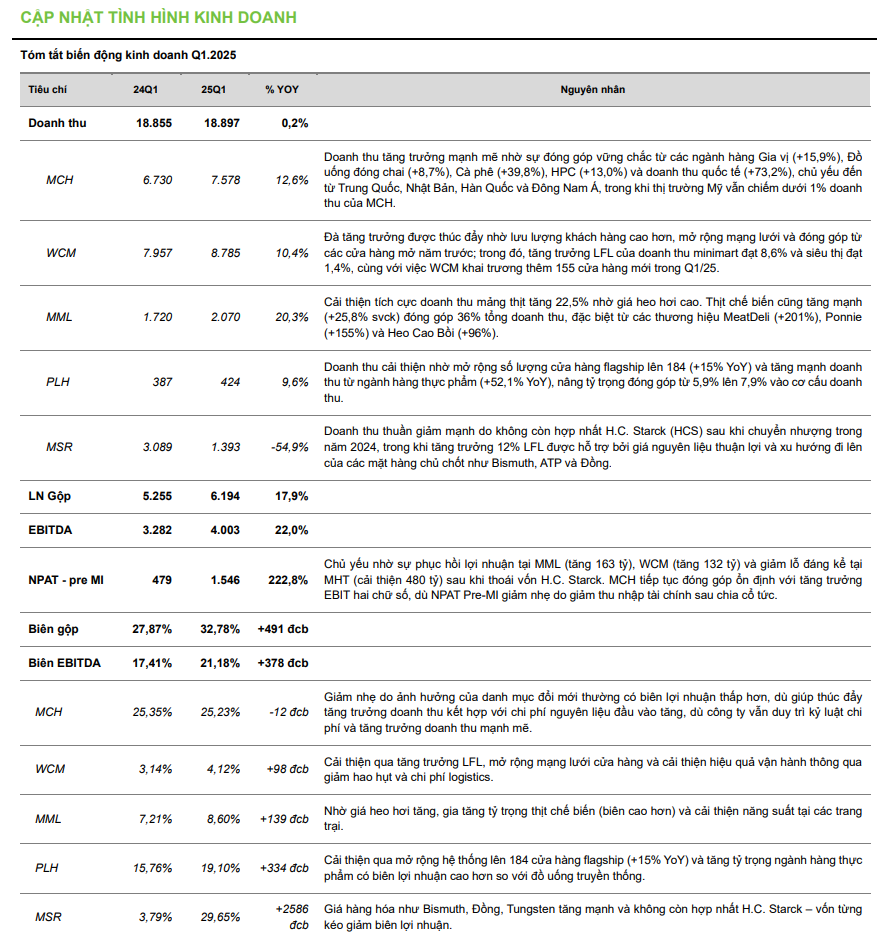 - MSN ghi nhận kết quả ổn định trong Q1/2025 với doanh thu thuần 18.897 tỷ đồng (+0,2% yoy; +11,1% yoy nếu loại trừ thoái vốn H.C. Starck) và LNST-CĐTS đạt 394 tỷ đồng (+278,8% yoy). Tăng trưởng mạnh mẽ đến từ các mảng tiêu dùng như MCH, WCM, MML và PLH với EBITDA tăng lần lượt 12,0%, 45,2%, 43,8% và 32,4% yoy.