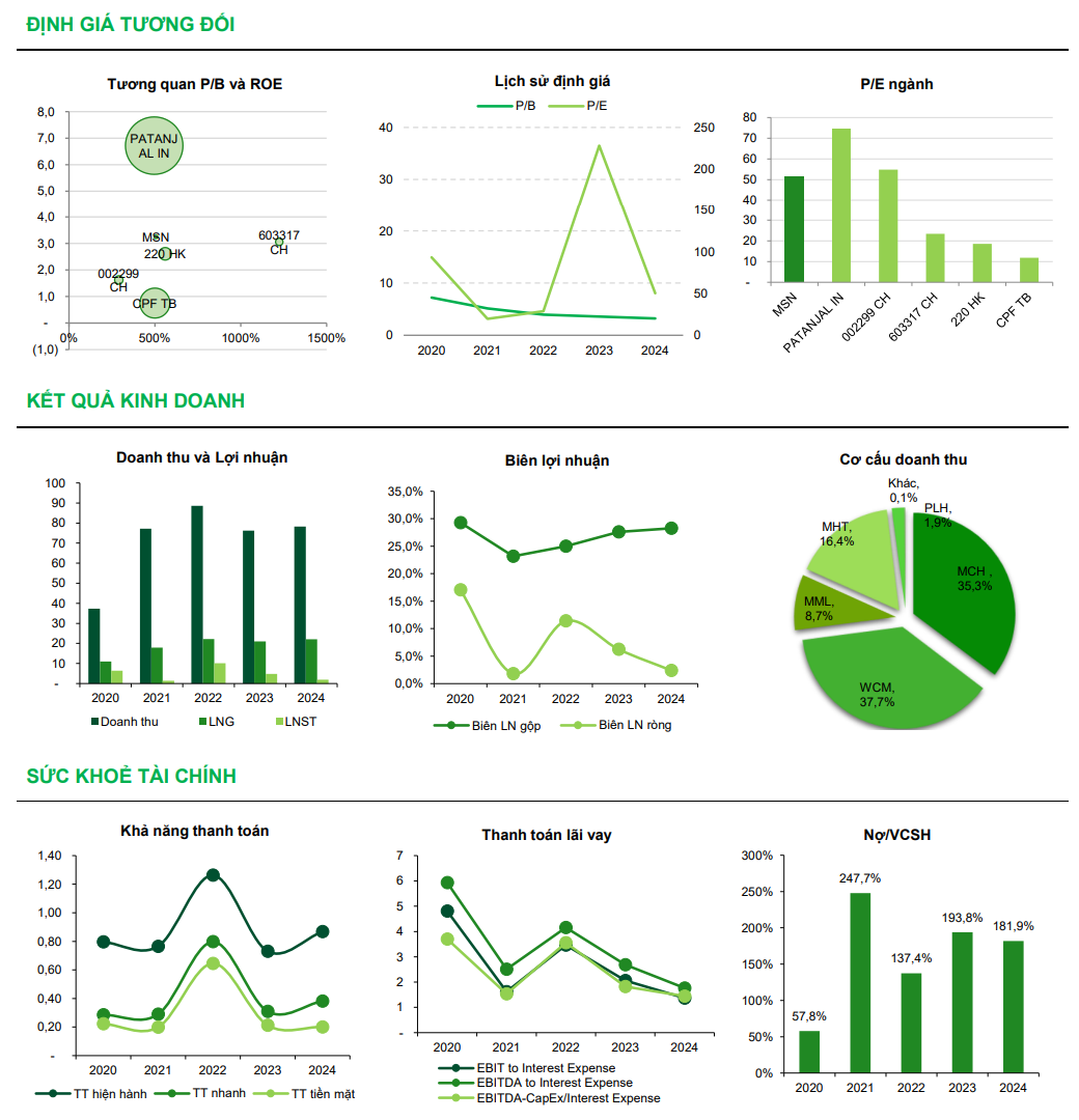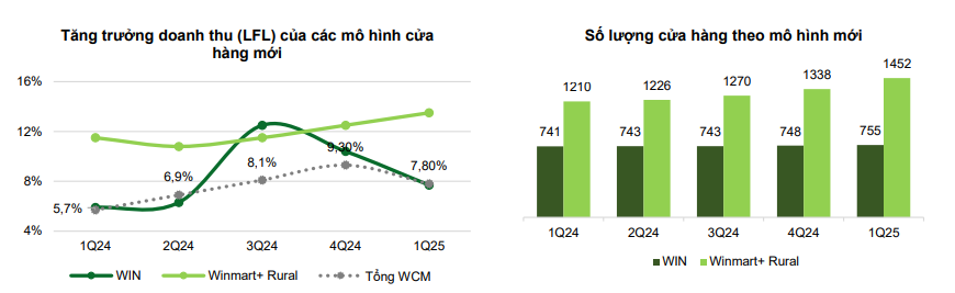 - Doanh thu Q1/25 của WCM đạt 37.000 tỷ đồng (+10% YoY), biên lợi nhuận ròng 1,6%, và mở thêm 155 cửa hàng, nâng tổng số lên 4.000 – lớn nhất cả nước, với mô hình minimart hiệu quả đặc biệt ở nông thôn. Toàn chuỗi đang hưởng lợi từ xu hướng hiện đại hóa bán lẻ, gia tăng tiêu dùng đa kênh và khai thác hiệu quả hệ sinh thái MSN, đặc biệt qua WIN Membership và các sản phẩm MCH, MML.