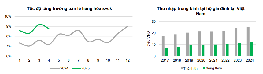 Đáng chú ý, khu vực nông thôn – nơi chiếm tới 61,8% dân số cả nước vào năm 2024 – đang nổi lên như một thị trường tiềm năng cho ngành bán lẻ, đặc biệt là đối với các thương hiệu hàng tiêu dùng nhanh (FMCG). Thu nhập hộ gia đình tại khu vực này tăng trưởng với tốc độ trung bình hàng năm (CAGR) 7,4% trong giai đoạn 2017–2024, cao hơn so với mức 5,5% tại các đô thị lớn. Sự gia tăng thu nhập và chuyển biến tích cực trong điều kiện kinh tế - xã hội của người tiêu dùng nông thôn mở ra cơ hội lớn cho doanh nghiệp mở rộng thị phần, đặc biệt ở các phân khúc còn nhiều dư địa tăng trưởng.
