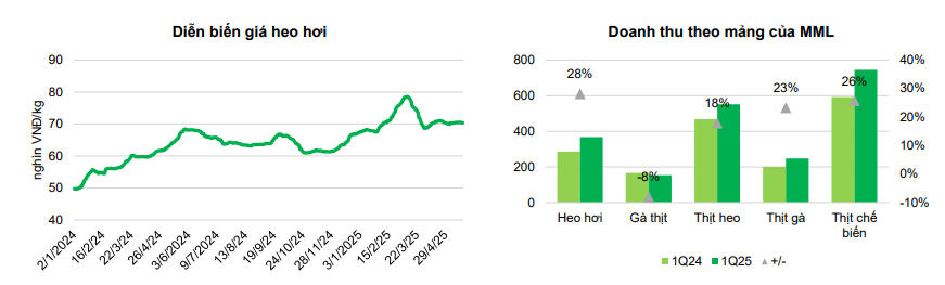 Trong Q1/2025, MML ghi nhận doanh thu thuần đạt 2.070 tỷ VNĐ (+20,4% svck), nhờ sự phục hồi của giá heo hơi và sản lượng bán tăng ở cả mảng thịt tươi lẫn thịt chế biến. Doanh thu mảng thịt đạt 1.664 tỷ VNĐ (+22,5%), trong đó thịt tươi đạt 919 tỷ (+21,7%) và thịt chế biến đạt 745 tỷ (+25,8%). Sự tăng trưởng mạnh đến từ việc mở rộng hệ thống phân phối, đặc biệt thông qua WinCommerce, và đóng góp tích cực từ các thương hiệu như MeatDeli (+201%), Ponnie (+155%) và Heo Cao Bồi (+96%). Mảng nông trại (farm) cũng ghi nhận tăng trưởng doanh thu 14,9%, đạt 407 tỷ đồng, nhờ giá heo hơi trung bình tăng 15,7% svck.