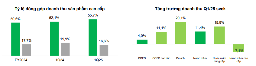 - Trong Q1/25, nhu cầu về thực phẩm tiện lợi cao cấp tiếp tục tăng mạnh, với Omachi của MCH đạt doanh thu tăng 20,1% YoY, góp phần nâng tỷ trọng sản phẩm cao cấp lên 56% trong ngành. Ở nhóm gia vị, sản phẩm mainstream và cận cao cấp như nước mắm và hạt nêm cũng tăng trưởng tốt nhờ người tiêu dùng chuyển sang lựa chọn chất lượng hơn, trong khi nước mắm cao cấp tăng trưởng chậm do thị trường phân mảnh và cạnh tranh mạnh.