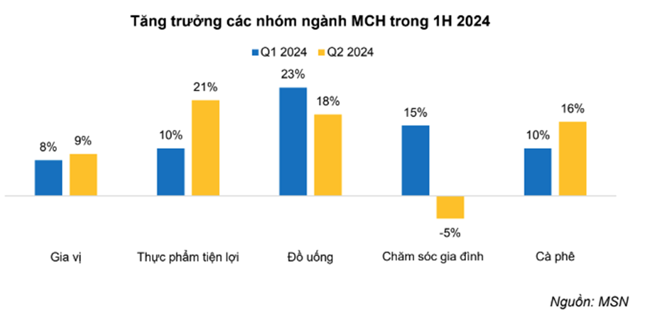 Doanh thu thuần đạt 13.968 tỷ (+11,6% yoy) và EBITDA đạt 3.557 tỷ (+16,2% yoy). Trong Q2 2024, ngoại trừ ngành hàng Chăm sóc gia đình, MCH ghi nhận tăng trưởng tích cực tất cả các nhóm ngành còn lại.