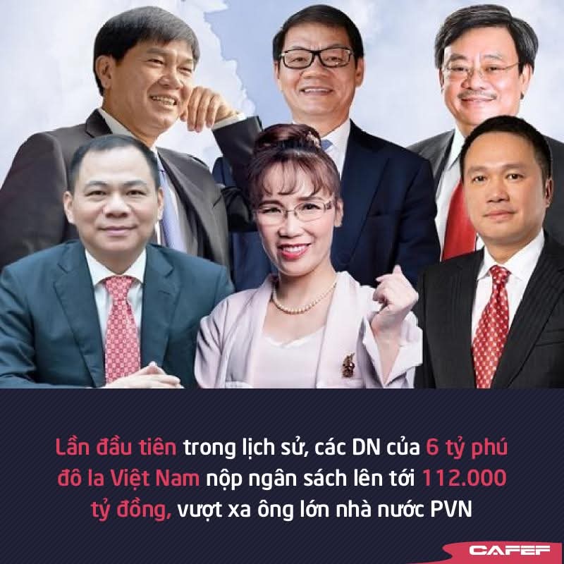 Lần đầu tiên trong lịch sử, các doanh nghiệp của 6 tỷ phú đô la Việt Nam đã nộp ngân sách vượt trội, lên tới 112.000 tỷ đồng, cao hơn cả tập đoàn lớn nhất nhà nước PVN.