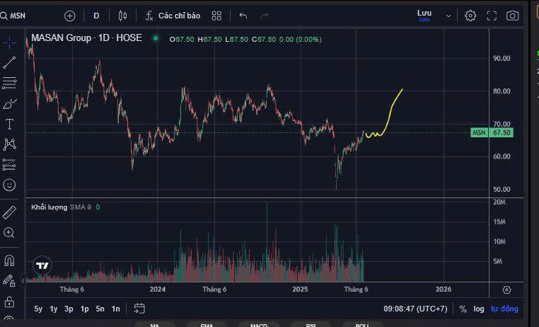 Dòng tiền luân phiên - MSN hưởng lợi! Dòng tiền xoay trục: Tuần này ghi nhận luân chuyển khỏi nhóm vốn hóa lớn/beta cao (đặc biệt ngân hàng, blue-chips) sang các mã có câu chuyện riêng và kết quả kinh doanh tích cực; cuối tháng 10 nhiều trụ giảm mạnh trong khi dòng tiền có xu hướng săn cơ hội ngắn hạn ở nhóm khác. MSN hấp dẫn hơn các peer (MWG, VNM, PNJ, FRT): MSN hội tụ nhiều động lực đồng thời (bán lẻ hiện đại WCM cải thiện biên lợi nhuận; MML quay lại tăng trưởng; MCH đang tái cấu trúc kênh GT nhưng MT & xuất khẩu tăng; MHT hưởng lợi giá APT) — nhờ đó hưởng lợi trực tiếp từ dòng tiền xoay trục sang nhóm Tiêu dung – Bán lẻ hiện tại. Về KQKD 3Q2025: • Doanh thu 21.164 tỷ; NPAT Pre-MI 1.866 tỷ (+43% YoY); nợ ròng/EBITDA 2,8x; 9T đạt >90% mục tiêu năm. • WCM: EBIT margin 2,6%; NPAT margin 1,7% nhờ LFL tốt ở minimart & siêu thị. • MCH: Doanh thu 7.517 tỷ (-5,9% YoY); EBIT margin 24,2%; GT đang phục hồi, MT +12,5% YoY, xuất khẩu +14,8% YoY. • MML: Doanh thu 2.384 tỷ (+23,2% YoY); NPAT Pre-MI 101 tỷ (↑5,2x); processed meat +14%. • PLH: Doanh thu 516 tỷ (+21,2% YoY), LFL ADS tăng. • MHT: Doanh thu LFL 2.041 tỷ (+33,4% YoY) nhờ giá APT & bismuth tăng; EBITDA margin 23,9%. • TCB (lợi nhuận liên kết): 1.242 tỷ (+9,4% YoY). SK thoái vốn: Giao dịch block trade giúp SK gần như rút hết, ngắn hạn có thể tạo áp lực cung từ các nhà đầu tư quay vòng; những về trung dài hạn thì tích cực cho MSN nhờ tái cấu trúc cho cổ đông, tăng freefloat và thu hút dòng tiền mới từ cá nhân và tổ chức. Vietcap hiện đinh giá cho MSN ~ 101.200 đồngcp.