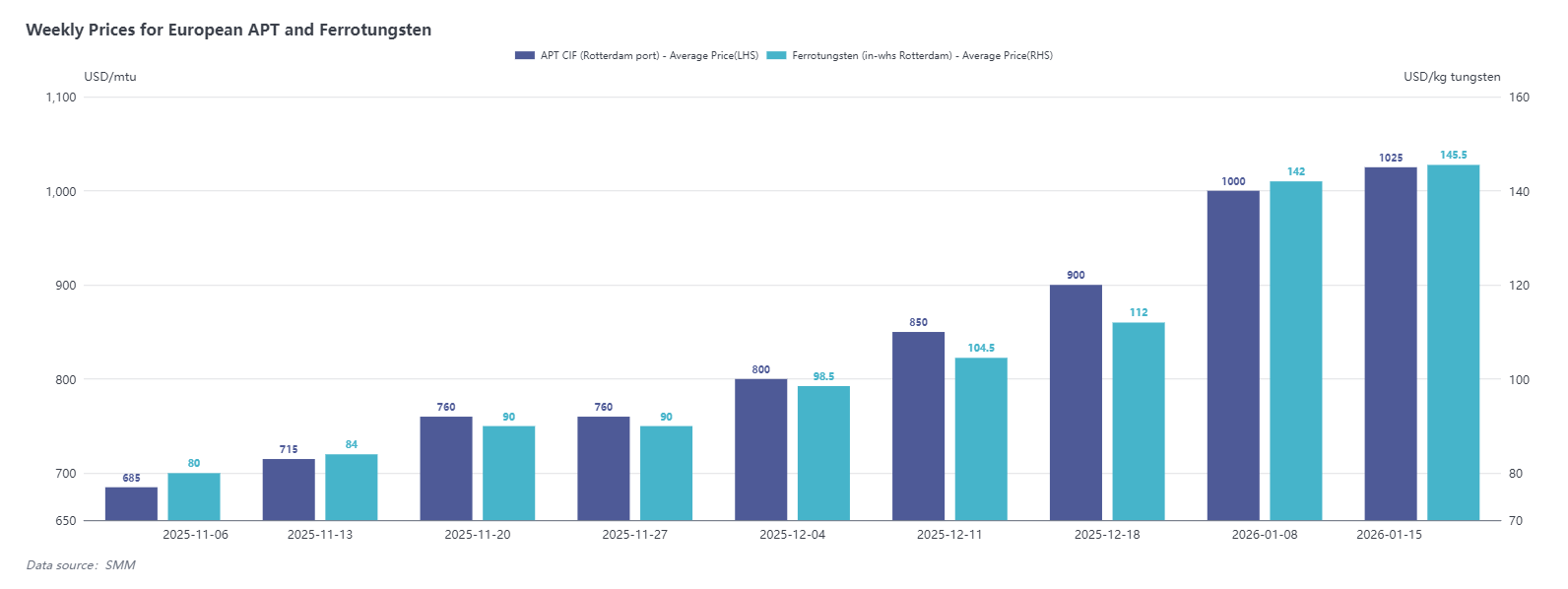 Tính đến thứ Sáu tuần trước, dữ liệu SMM cho thấy giá cảng CIF Rotterdam cho ammonium paratungstate (APT) là 1.000-1.050 đô la/mtu, với giá trung bình là 1.025 đô la/mtu, tăng 25 đô la/mtu từ ngày 8 tháng 1; giá cho ferrotungsten (kho Rotterdam) là 142-149 đô la/kg W, với giá trung bình là 145,5,5 đô la/kg W, tăng 3,5 đô la/kg W từ ngày 8 tháng 1.