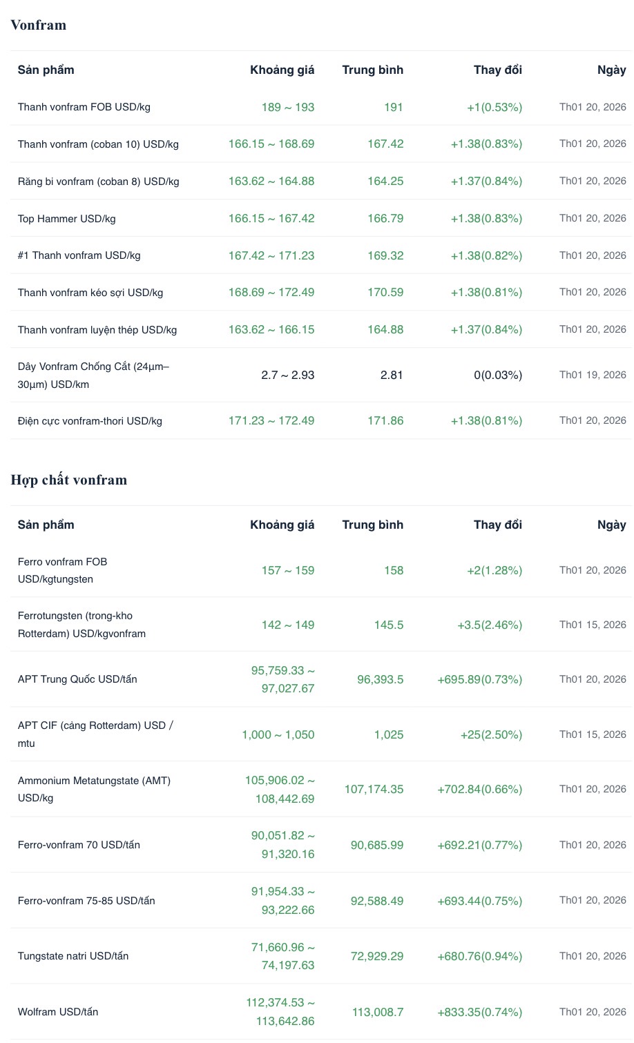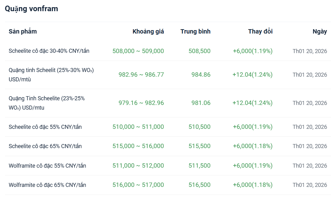 Tính đến thứ Sáu tuần trước, dữ liệu SMM cho thấy giá cảng CIF Rotterdam cho ammonium paratungstate (APT) là 1.000-1.050 đô la/mtu, với giá trung bình là 1.025 đô la/mtu, tăng 25 đô la/mtu từ ngày 8 tháng 1; giá cho ferrotungsten (kho Rotterdam) là 142-149 đô la/kg W, với giá trung bình là 145,5,5 đô la/kg W, tăng 3,5 đô la/kg W từ ngày 8 tháng 1.