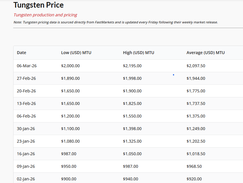 Vonfram đang bước vào một giai đoạn tăng giá mạnh do cú sốc nguồn cung toàn cầu. Từ đầu năm 2026 đến nay, giá vonfram đã tăng gần như theo đường thẳng đứng và hiện vượt 2.000 USD/MTU, tương đương hơn gấp đôi so với đầu năm.