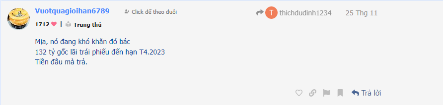 Trái phiếu tới hạn kìa, lái đốt đít, dụ nhỏ lẻ kìa, quí 4 này không ổn đâu. Toàn bác nói trong các bài ở trên đấy nhé, bác còn kêu, lên 5 bán, giờ bác hô để bán à. 145tỷ ở công ty xăng dầu Hưng Yên, BIDV ra thông báo tịch thu tài sản của công ty xăng dầu Hưng Yên. Có thực sự ổn không bác. Bác là 1von4loi à