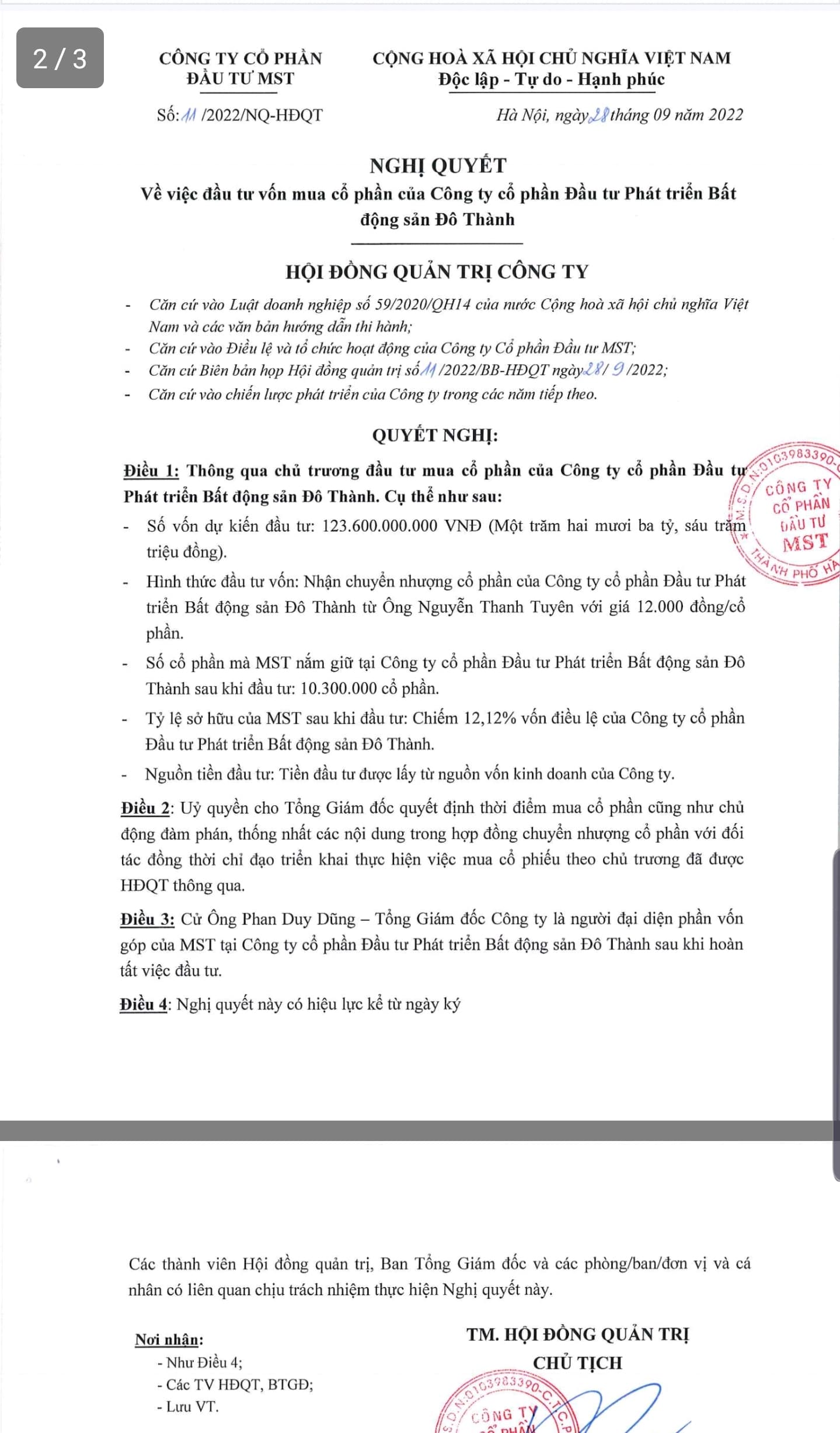 Công ty CP Đầu tư và Phát triển Bất động sản Đô Thành là ai mà MST mua sở hữu trực tiếp thành 12%