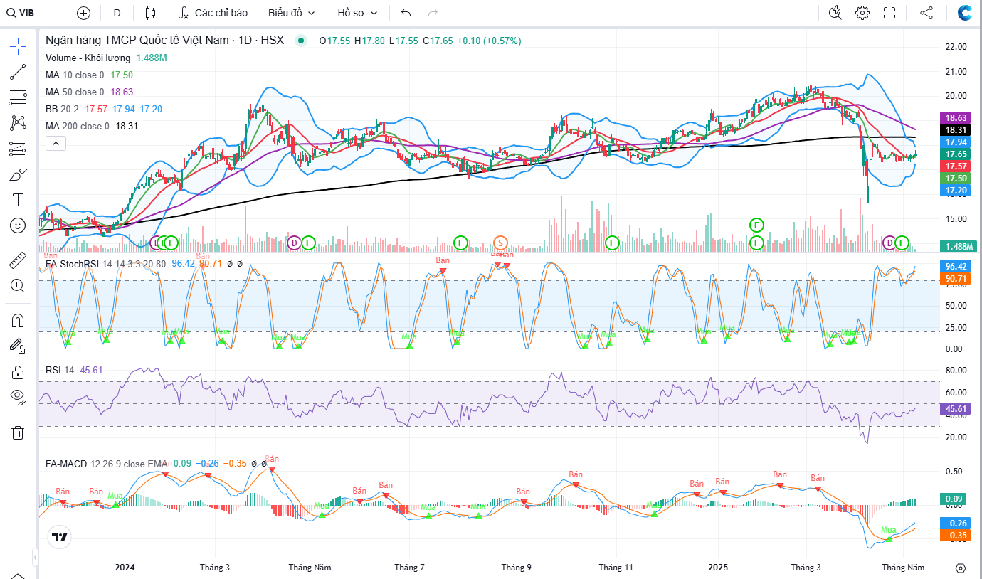 Sau khi tạo đáy tại vùng 15.7 thì VIB đã trở lại trên ngưỡng hỗ trợ 17.3 và dần tạo vùng cân bằng tại đây ( mặc dù diễn biến còn khá trầm lắng). Áp lực nguồn cung đang thể hiện ở mức thấp thể hiện qua thanh khoản thấp khi VIB lùi bước. Dự kiến VIB sẽ tiếp tục được hỗ trợ tại Ma20 và có cơ hội hồi phục trong sắp tới.