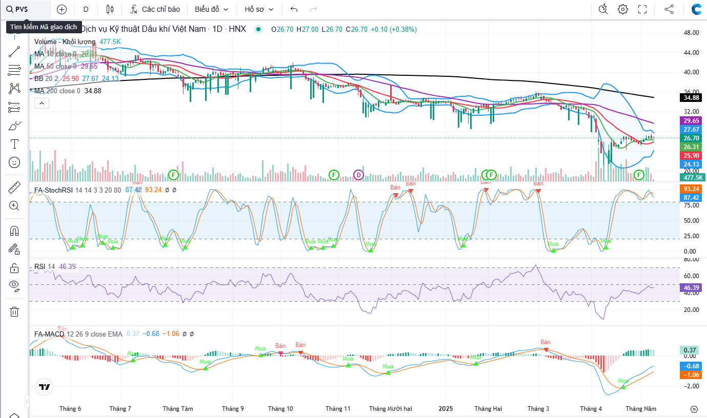 Sau nhiều phiên bám sát đường Ma20, PVS đã vượt qua đường này với 4 phiên dần tăng giá kèm thanh khoản khởi sắc. Tín hiệu này có thể hỗ trợ và giúp PVS nới rộng đà hồi phục trong thời gian tới. Vùng cản cần chú ý quanh 27.2