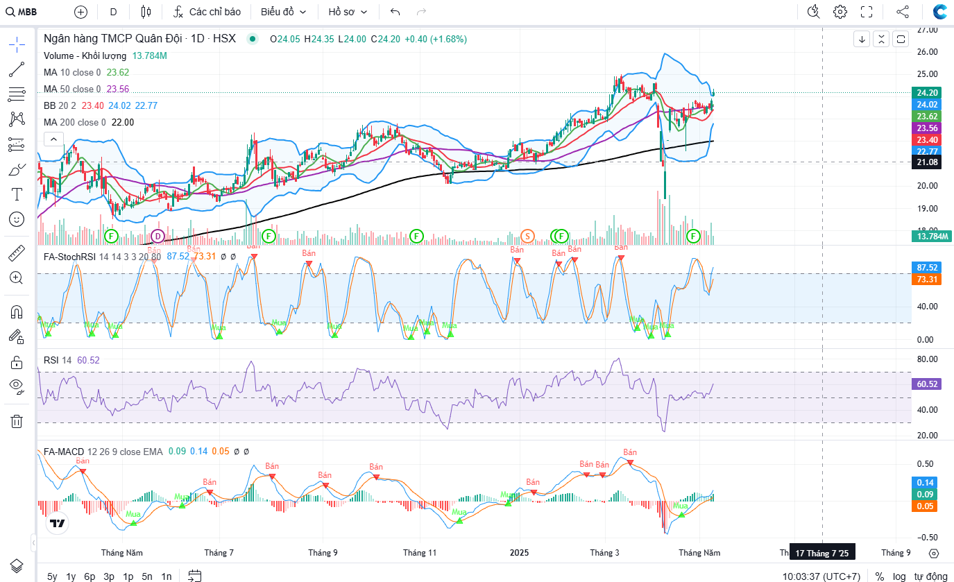 MBB ghi nhận tín hiệu tăng tích cực sau khi liên tục kiểm định lực cầu quanh đường hỗ trợ ma20. Biên độ nến tăng kết hợp với thanh khoản đã có sự cải thiện rõ rệt. Ngưỡng kháng cự tiếp theo của cổ phiếu sẽ là vùng đỉnh lịch sử quanh 25.