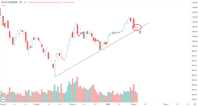 VN-Index năm 2022 đã hình thành đường trendline giảm, tạo nên áp lực bán lớn khi giá tiệm cận đường trendline này.Tuy nhiên, xu hướng giảm được phá vỡ nhờ tuần tăng điểm mạnh mẽ trước Tết Nguyên đán: