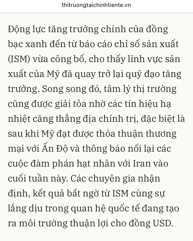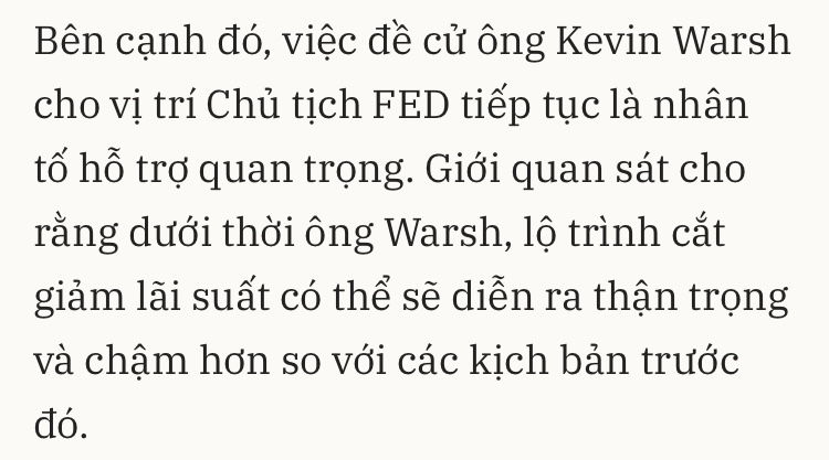 Cơ bản xoay quanh 2 yếu tố: tâm lý thị trường (niềm tin) quay trở lại kỳ vọng vào sự tăng trưởng của Mỹ; và giải toả tâm lý bi quan về xung đột địa chính trị thời gian qua. Warsh là nhân tố phụ trợ.