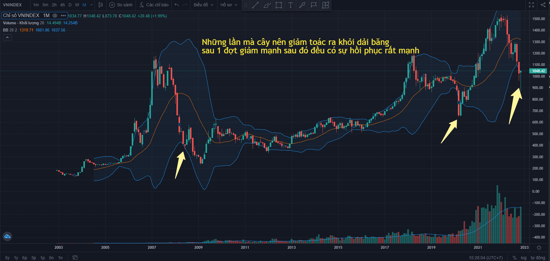 Thị trường đang trong 1 pha giảm mạnh. Cổ phiếu có tháng giảm điểm toác ra khỏi dải băng thì sau đó đều kéo theo 1 đợt hồi phục mạnh