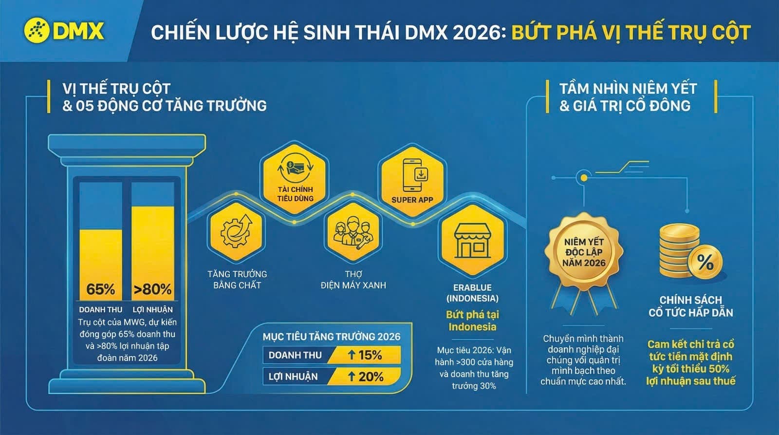 - Năm 2026, ĐMX đặt mục tiêu tăng trưởng: Doanh thu tăng 15%, lợi nhuận tăng 20% so với năm 2025, khẳng định vị thế dẫn đầu trong lĩnh vực bán lẻ điện thoại – điện máy tại Việt Nam.
