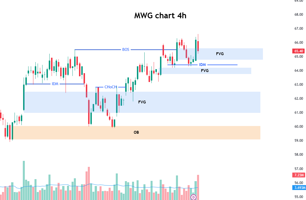 Về khung nhỏ theo SMC có thể thấy giá đã xử lí xong các vùng thanh khoản và tạo CHOCH, phiên thứ 6 chính thức tạo Bos ( phá vỡ cấu trúc trước đó )