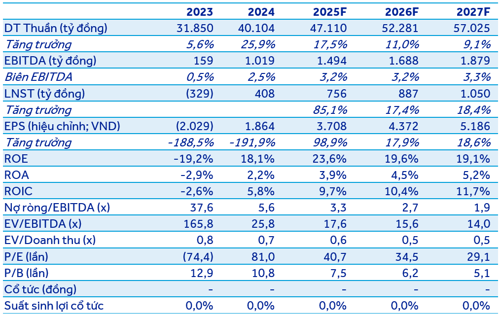 Chúng tôi dự phóng công ty có thể đạt doanh thu thuần 47.110 tỷ đồng (+17,5% svck) và LNST 756 tỷ đồng (+85,1% svck) trong 2025, cao hơn 8% so với dự phóng LNST trước đây. Kết hợp phương pháp DCF và EV/Doanh thu, giá mục tiêu của chúng tôi cho FRT đến 6T2026 là 161.500 đồng/cổ phiếu.