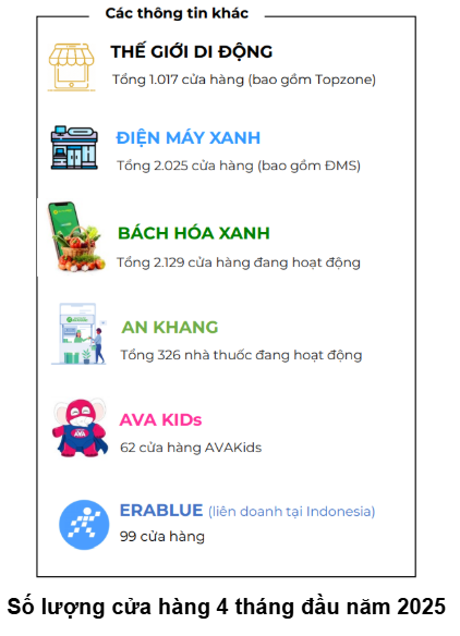 - Doanh thu 4 tháng đầu năm 2025 của Bách hóa xanh tăng 21% so với cùng kỳ, đạt gần 15000 tỷ đồng, chiếm 30,8% doanh thu công ty.