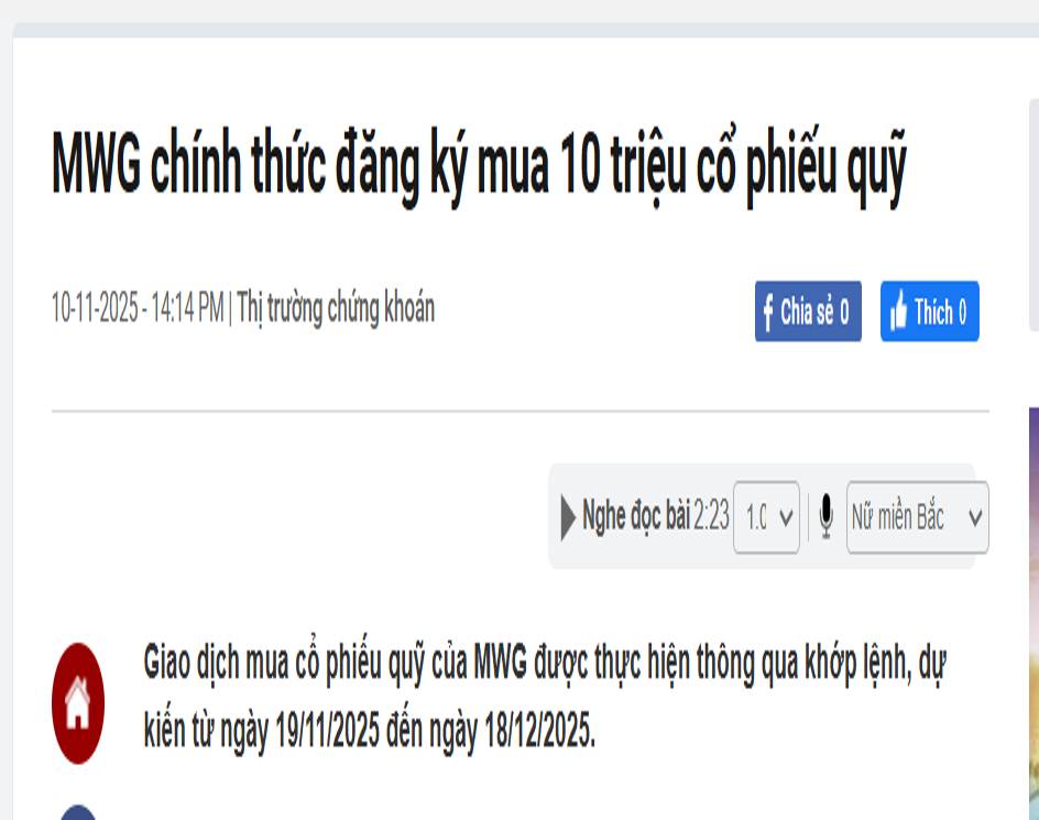 Kể từ 19/11/2025 tới 18/12/2025, MWG đăng ký mua lại 10 triệu cổ phiếu quỹ thông qua giao dịch khớp lệnh (Hình 7) Khối lượng này khoảng 2 lần khối lượng giao dịch bình quân của cổ phiếu MWG trên thị trường. => Tạo 1 lực cầu tích cực cho MWG trên thị trường nếu giá cổ phiếu điều chỉnh.