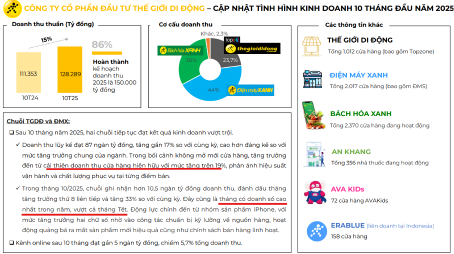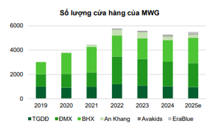 MWG là doanh nghiệp sở hữu Chuỗi Thế Giới Di Động (TGDĐ); Chuỗi Điện Máy Xanh (ĐMX); Chuỗi Bách Hóa Xanh (BHX); một vài chuỗi khác như An Khang, EraBlue (Indo). Trong đó TGDĐ và ĐMX đã chạm ngưỡng bão hoà, các mảng yếu thế đang cắt giảm, động lực chính chỉ từ BHX. Chuỗi này đang trong quá trình mở rộng cửa hàng tới miền Bắc.