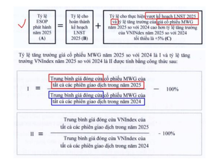 Ban lãnh đạo của MWG thường nhận mức thù lao thấp, chủ yếu đổi lại bằng ESOP. Điều này đã kéo dài qua nhiều năm. Dựa vào công thức tính mới nhất trong 2025, để nhận được mức ESOP lớn trong 2025, 2026 và cả các năm tới, giá cổ phiếu cần tăng trưởng. Như vậy, ban lãnh đạo có lý do để muốn cổ phiếu MWG tăng giá.
